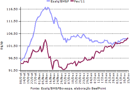 Gráfico 1. Indicador Esalq/BM&FBovespa boi gordo à vista x contratos futuros para fevereiro/11
