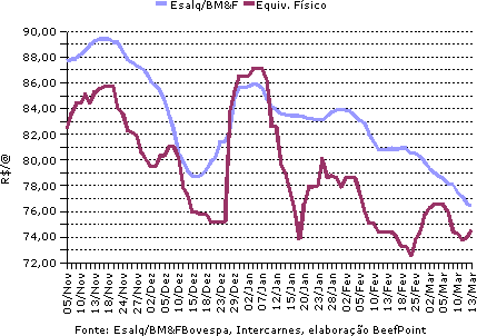 Na BM&FBovespa, com exceção de maio/09, todos os vencimentos fecharam em baixa. Março/09 teve desvalorização de R$ 0,21, fechando a R$ 74,51/@. O contratos com vencimento em maio/09 registraram variação positiva de R$ 0,02, fechando a R$ 71,78/@, com 1.740 contratos negociados e 6.832 contratos em aberto. A maior variação, -R$ 0,46, ocorreu nos contratos que vencem em novembro/09, que fecharam a R$ 77,54/@.