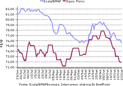 A BM&FBovespa acompanhou a movimentação do indicador e fechou em queda. O primeiro vencimento, outubro/09, fechou a R$ 75,80/@, com recuo de R$ 0,62. Os contratos que vencem em novembro/09 registram forte retração (-R$ 1,23), fechando a R$ 77,11/@.