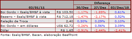 No primeiro dia útil de 2011, o indicador Esalq/BM&FBovespa boi gordo à vista foi cotado a R$ 103,50/@, com retração de R$ 1,23. O indicador a prazo registrou queda de R$ 2,05, sendo cotado a R$ 104,22/@.