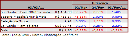 O indicador Esalq/BM&FBovespa boi gordo à vista foi cotado a R$ 104,93/@ com desvalorização de R$ 0,28. O indicador a prazo registrou valorização de R$ 0,16, sendo cotado a R$ 106,94/@.