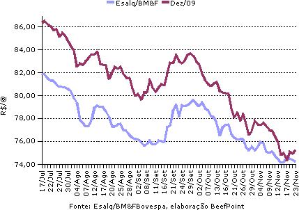 O mercado futuro fechou em alta, com variação positiva em todos os vencimentos. Novembro/09 – que será liquidado na próxima segunda-feira -, fechou a R$ 74,83/@, com valorização de R$ 0,32, 1.032 contratos negociados e 6.293 contratos em aberto. Os contratos que vencem em dezembro/09 registraram alta de R$ 0,38, fechando a R$ 75,27/@.