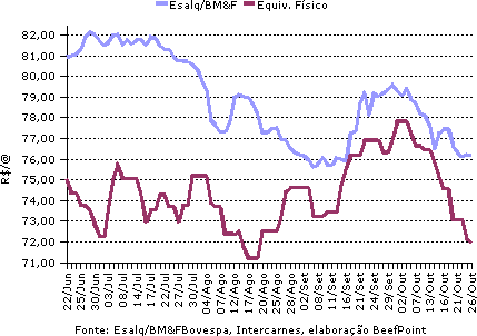 O indicador Esalq/BM&FBovespa boi gordo à vista foi cotado a R$ 76,17/@, com variação negativa de R$ 0,04. O indicador a prazo teve queda de R$ 0,09, sendo cotado a R$ 77,60/@.