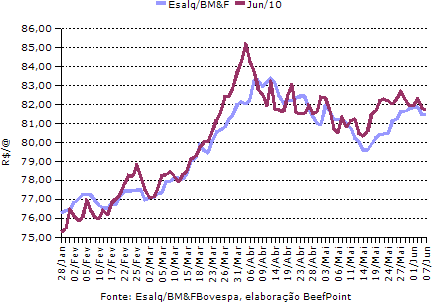 A BM&FBovespa seguiu em baixa, com variação negativa em todos os vencimentos. Junho/10 fechou a R$ 81,69/@, com retração de R$ 0,12. Os contratos que vencem em outubro/10 registraram queda de R$ 0,09, fechando a R$ 84,48/@.