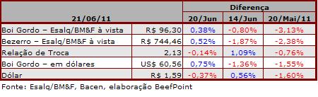O indicador Esalq/BM&FBovespa boi gordo à vista foi cotado a R$ 96,30/@, com valorização de R$ 0,36. O indicador a prazo teve alta de R$ 0,10, sendo cotado a R$ 97,53/@.