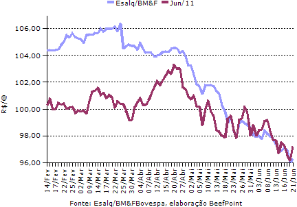 Gráfico 1. Indicador Esalq/BM&FBovespa boi gordo à vista x contratos futuros para junho/11