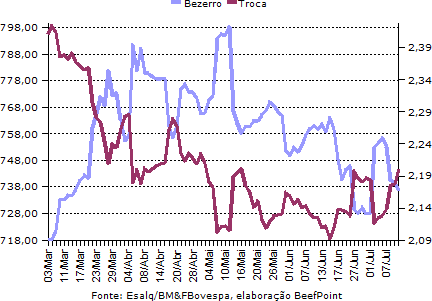 O indicador Esalq/BM&FBovespa boi gordo à vista foi cotado a R$ 98,22/@, com valorização de R$ 0,60. O indicador a prazo registrou alta de R$ 0,90, sendo cotado a R$ 99,57/@.