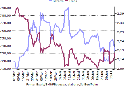 Gráfico 3. Indicador Esalq/BM&FBovespa bezerro MS à vista (R$/cabeça)x relação de troca (boi gordo de 16,5@ por bezerros)