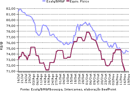 Na última quinta-feira (19/11), o indicador Esalq/BM&FBoi gordo à vista foi cotado a R$ 74,38/@, com desvalorização de R$ 0,14. O indicador a prazo recuou R$ 0,24, sendo cotado a R$ 75,76/@.