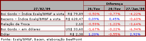 A BM&FBovespa terminou a semana em baixa. Fevereiro/09 fechou a R$ 80,41/@, com desvalorização de R$ 0,14. Os contatos que vencem em março/09 apresentaram retração de R$ 1,44, fechando em R$ 76,76/@. Os contratos para maio/09 fecharam a R$ 73,53/@, com recuo de R$ 0,92, 2.664 contratos negociados e 5.851 contratos em aberto. A maior variação (-R$ 1,60) ocorreu nos contratos que vencem em novembro/09, que fecharam a R$ 79,55/@.
