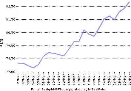 O indicador Esalq/BM&FBovespa boi gordo à vista foi cotado a R$ 81,99/@, uma alta de 1,79% na semana. O indicador a prazo acumulou variação positiva de 1,63% no período (24/03 a 31/03), sendo cotado a R$ 82,88/@ na última quarta-feira. Durante o mês de março este indicador registrou alta de 5,35%.