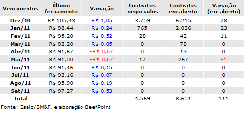 Na BM&FBovespa, o primeiro vencimento, dezembro/10, fechou a R$ 105,43/@, com valorização de R$ 1,05. Os contratos que vencem em janeiro/11, registraram alta de R$ 0,24, fechando a R$ 98,44/@.