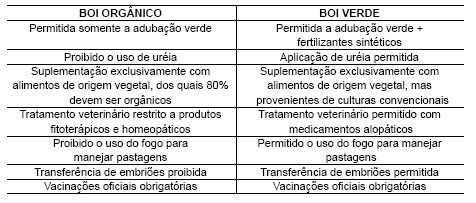 É permitido o confinamento destes animais até 90 dias antes do abate, o que também acontece com o “boi orgânico”. Mas as coincidências acabam por aí. No quadro a seguir são demonstradas algumas diferenças básicas entre os dois modos de produção.