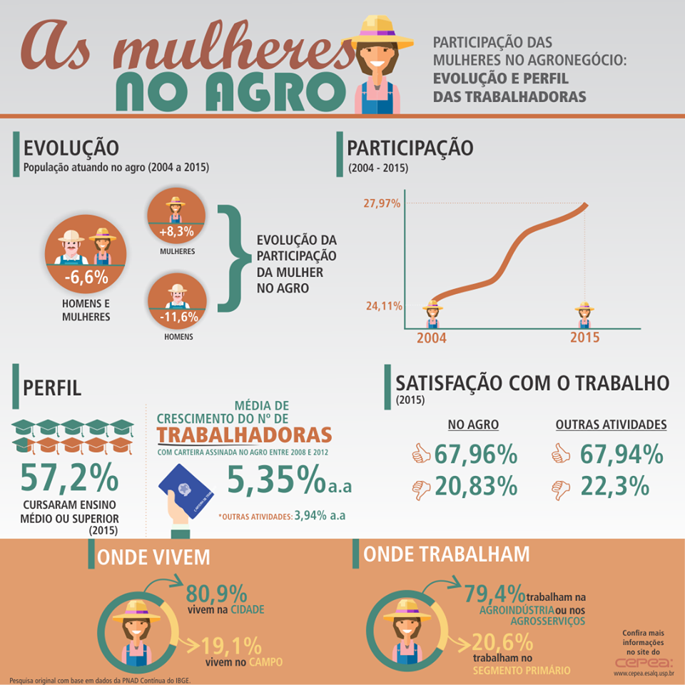 Diante desse contexto, e dando continuidade à série de estudos referentes ao Mercado de Trabalho do Agronegócio, o Cepea (Centro de Estudos Avançados em Economia Aplicada), da Esalq/USP, elaborou uma pesquisa, dividida em três volumes, visando avaliar os principais aspectos referentes à atuação da mulher no mercado de trabalho do agronegócio brasileiro, considerando um panorama recente. Buscou-se trazer evidências empíricas e dados atualizados acerca do tema.