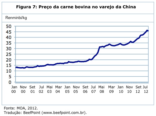 Na China, a situação de oferta escassa continuou no terceiro trimestre de 2012, resultando em preços da carne bovina bem maiores (21% a mais) (Figura 7). À medida que o inverno é a estação alta para o consumo de carne bovina, os preços deverão aumentar mais no primeiro trimestre de 2013.