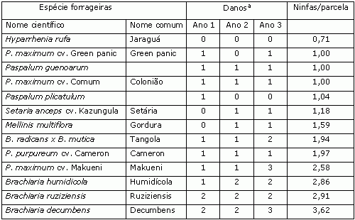 Tabela 1: Nível de resistência de gramíneas forrageiras à cigarrinha das pastagens na região do cerrado (Deois flavopicta).
