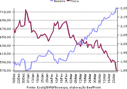 Gráfico 3. Indicador Esalq/BM&FBovespa e contratos futuros de boi gordo (valores à vista), em 20/04/10 e 28/04/10