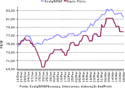 Nesta semana o indicador Esalq/BM&FBovespa boi gordo à vista teve desvalorização de 0,96%, sendo cotado a R$ 81,37/@ na última quarta-feira. O indicador prazo foi cotado a R$ 82,45/@, com retração de 0,84% no período analisado (20/04 a 28/04). Apesar dos recuos do últimos dias, em relação ao mesmo período do mês passado este indicador subiu 1,18%.
