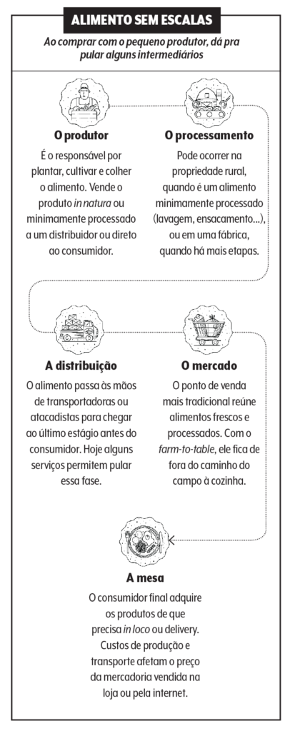 A pandemia também reinventou as formas de adquirir os ingredientes, abrindo oportunidades para os pequenos produtores. Com as restrições de circulação e a redução nas idas a feiras e mercados a m de evitar aglomerações, despontaram e cresceram serviços que fazem a ponte entre quem cultiva e quem consome.