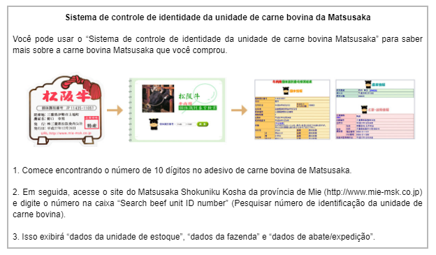 Os consumidores podem acessar um site e inserir o número mostrado no adesivo da carne bovina Matsusaka no “Sistema de controle de identidade da unidade de carne bovina Matsusaka” para descobrir tudo, desde o nome do animal até a data de nascimento, local de nascimento, onde foi engordado, sua linhagem de três gerações, além do nome do confinamento e o número de dias de engorda do animal (veja o quadro abaixo). A data em que a vaca foi abatida, a data de envio, o endereço e o número de telefone do comprador da carcaça também estão incluídos, garantindo a segurança da carne adquirida (disponível somente em japonês).