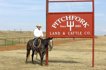 Oficialmente conhecida como Pitchfork Land & Cattle Company de St. Louis, Missouri, a fazenda administra gado comercial: Angus e Herefords, bem como o “black baldy”, um termo que se refere ao cruzamento de Angus e Hereford. Há também cruzamentos do sul do Texas.