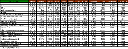 A maior variação positiva, de 17,4%, foi registrada pelo item Sementes Forrageiras, devido à maior demanda pelo insumo para a formação ou recuperação dos pastos. A renovação das pastagens indica que pecuaristas estão esperando por um ciclo melhor da cadeira produtiva, investindo em ganhos de produtividade. O item Mão-de-obra subiu 11,7%, por conta do aumento do salário mínimo. Para Máquinas e implementos agrícolas houve alta de 7,8% entre janeiro e dezembro de 2009.