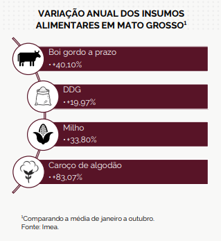 Levantamento feito pelo Instituto Mato-grossense de Economia Agropecuária (Imea) aponta que, entre janeiro e outubro, milho, DDG e caroço de algodão registraram aumentos significativos no comparativo anual.