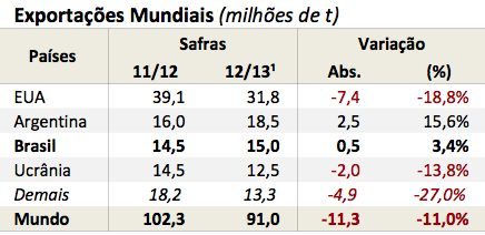 Exportações mundiais: Para as exportações mundiais, o volume foi reajustado para 91,0 milhões de t, com uma redução de 11,3 milhões de t na comparação com 2011/12