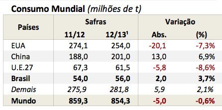 O relatório aponta para um consumo recorde na China, que deve alcançar em 2012/13 um volume de 75 milhões de t, crescimento de 5,8% em relação à 2011/12.