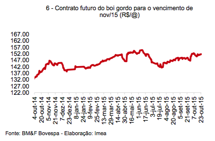 – Os contratos futuros com vencimento em nov/15 fecharam com elevação novamente, desta vez de 0,30%, ao preço de R$ 151,40/@.