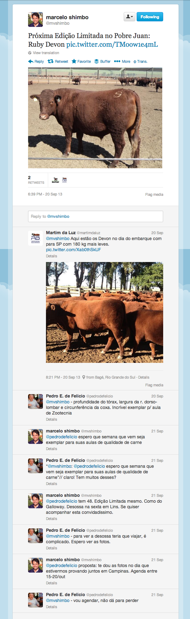 Confira a conversa sobre os detalhes dos animais e da carne, no twitter, entre Marcelo Shimbo e o Prof. Pedro de Felício: