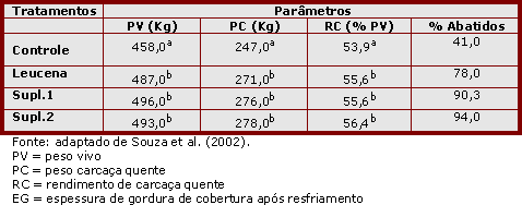 As medidas de espessura de gordura de cobertura, avaliadas após resfriamento na altura da 12a costela, foram maiores para os animais Supl.1 e 2. Os animais dos tratamentos leucena e controle não diferiram entre si, e apesar de apresentarem menor espessura de gordura de cobertura, atingiram 3 mm que é a quantidade mínima necessária para se evitar problemas no resfriamento.