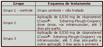 Para se evitar influencia de outras variáveis, como manejo e aspectos climáticos e nutricionais, o experimento foi conduzido avaliando os três grupos simultaneamente. Foram avaliadas 232 vacas, sendo 113 primíparas (1o parto) e 119 multíparas (2o ao 5o parto). Somente foram considerados animais apresentando parto normal. Após o parto estes animais foram divididos aleatoriamente em 3 grupos de tratamento conforme descrito na Tabela 1. Assim, o primeiro animal foi incluído no grupo 1, o segundo no grupo 2, o terceiro no grupo 3, o quarto no grupo 1 e assim sucessivamente.