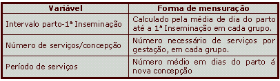 Para as análises estatísticas os animais foram divididos em dois sub-grupos: A: Primíparas: fêmeas de 1a cria e B: Multíparas: fêmeas de 2a a 5a cria. Foram comparados entre os grupos e sub-grupos, o intervalo parto-1a Inseminação (IA); número de serviços por concepção e período de serviço.
