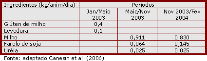 O fornecimento foi feito na quantidade exata de ingestão diária para o tratamento SD, o dobro da quantidade para o tratamento DA e quantidade de ingestão diária de segunda a sexta e o triplo as sextas-feiras para o tratamento FS. Os suplementos utilizados apresentaram as seguintes formulações para cada período (Tabela 1).