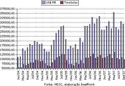 Segundo dados do Ministério do Desenvolvimento, Indústria e Comércio Exterior (MDIC), em setembro as exportações de carne bovina in natura apresentaram recuo tanto em receita quanto em volume exportado se comparado ao mês de agosto, que foi marcado pelo crescimento nas exportações quando a receita atingiu a marca de US$ 306,46 milhões. O preço médio da carne exportada durante setembro foi de US$ 2.957/tonelada, valor 6,7% superior a agosto de 2007 e 6,9% maior que doze meses atrás, quando a tonelada era vendida a US$ 2.766. Esse é o preço médio mais alto já registrado, ultrapassando em 3,3% o valor de outubro de 2006 (US$ 2862,80/ton) que era considerado o recorde anterior.