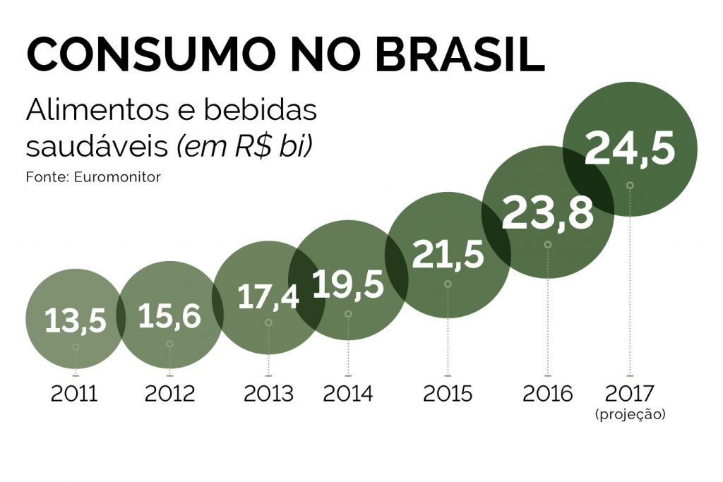 Os números colocam o Brasil como o quinto maior mercado no consumo de alimentos saudáveis e o sétimo no de bebidas. Mesmo com a renda em queda e desemprego em alta, a perspectiva do segmento de orgânicos é crescer até 30% este ano, segundo a Organis, entidade criada em 2015 e que reúne 44 empresas e produtores.