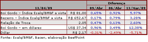 No mercado futuro, os contratos de boi gordo fecharam em alta, com exceção dos que vencem em setembro/09, que registraram recuo de R$ 0,10, fechando a R$ 83,85/@. O primeiro vencimento, abril/09, fechou a R$ 80,60/@, com a maior variação do dia (+R$ 0,75). Os contratos com vencimento em maio/09 registraram alta de R$ 0,61, fechando a R$ 78,44/@, com 1.723 contratos negociados e 6.649 contratos em aberto.