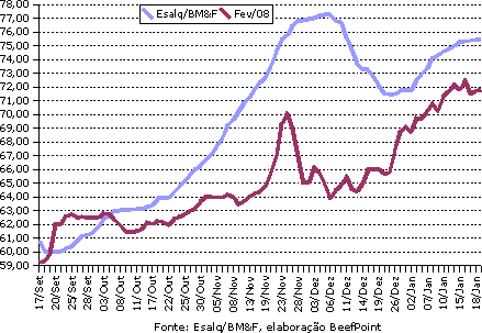 O indicador Esalq/BM&F boi gordo à vista foi cotado a R$ 75,46/@, alta de R$ 0,03. Em contrapartida, o indicador a prazo permaneceu estável, a R$ 76,22/@. Na BM&F, os contratos com vencimento no curto prazo tiveram valorização. Janeiro/08 fechou a R$ 74,60/@, alta de R$ 0,36, com 381 contratos negociados e 4.387 contratos em aberto. Os contratos com vencimento em fevereiro/08 tiveram alta de R$ 0,15, fechando a R$ 71,85/@. Já os contratos com vencimento mais distante apresentaram recuos. É o caso de agosto, setembro e outubro, este último fechou a R$ 74,02/@ (-R$ 0,03), com 256 contratos negociados e 10.513 contratos em aberto.