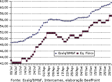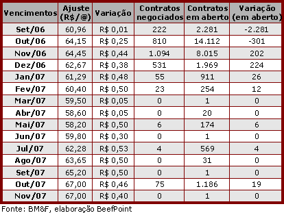 O contrato para setembro/06 se encerrou em R$ 60,96/@ (+R$ 0,01), liquidando 2.281 contratos em aberto. Outubro/06 fechou em R$ 64,15/@ (+R$ 0,25) e novembro/06 em R$ 64,45/@ (+R$ 0,44).