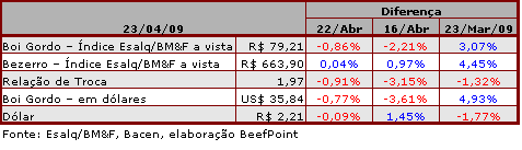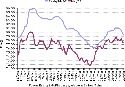 A BM&FBovespa fechou em baixa, a exceção foram os contratos com vencimento em junho/09 (R$ 78,60/@) e julho/09 (R$ 81,10/@) que tiveram variação positiva de R$ 0,19 e R$ 0,04, respectivamente. O primeiro vencimento, abril/09, fechou a R$ 78,95/@, com baixa de R$ 0,55. Maio/09 apresentou retração de R$ 0,23, fechando a R$ 77,28/@ e outubro/09 fechou a R$ 83,92/@ (-R$ 0,35).