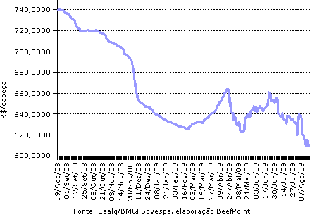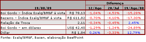 No mercado futuro, os contratos de boi gordo da BM&FBovespa apresentaram forte recuo. Na semana, o primeiro vencimento, agosto/09, registrou variação negativa de R$ 1,06, fechando a R$ 77,80/@ na última quarta-feira. Os contratos com vencimento em outubro/09, apresentaram a maior variação semanal (-R$ 2,71) fechando a R$ 80,65/@.
