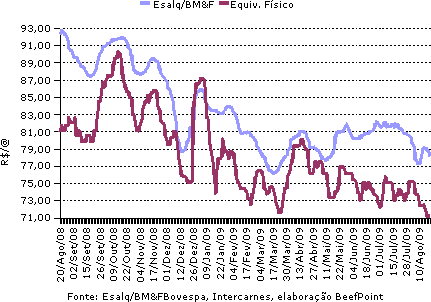 Gráfico 2. Indicador Esalq/BM&FBovespa e contratos futuros de boi gordo (valores à vista), em 12/08/09 e 19/08/09