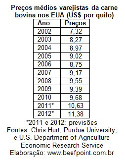 Os consumidores dos Estados Unidos enfrentarão a menor oferta de carne bovina disponível por pessoa em 50 anos e os preços no varejo alcançarão valores recordes. “Os preços da carne bovina no varejo alcançaram valor recorde em 2010, que foi quebrado em 2011, e que será quebrado em 2012 e, provavelmente, quebrado novamente a cada ano até 2015”, disse o economista de extensão agrícola da Universidade Purdue, Chris Hurt.