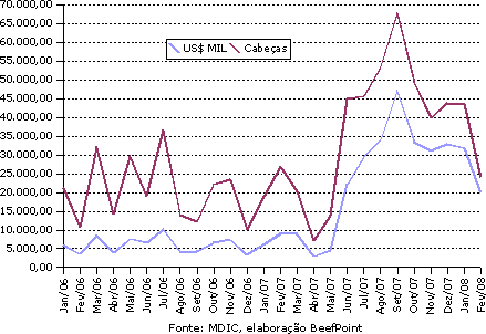 Gráfico 1.Evolução das exportações brasileiras de gado em pé (receita e número de animais exportados), de janeiro de 2006 a fevereiro de 2008
