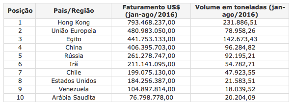 Os dois principais mercados para a carne brasileira no mês de agosto – Hong Kong e União Europeia – também apresentaram crescimento, tanto em volume como receita, se comparado com o mês de julho de 2016. Hong Kong comprou 29,3 mil toneladas de carne em agosto, um crescimento de 20% em relação ao mês anterior, com faturamento de US$ 99,2 milhões (24% a mais que julho). Outro destaque do mês é a União Europeia, que importou 28% a mais de carne brasileira no mês (11,7 mil toneladas), o que gerou uma receita 36% maior (US$ 74 milhões).