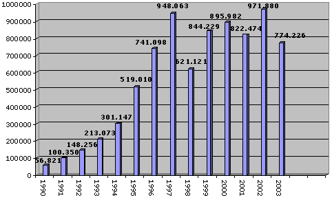 Número de animais exportados pela Austrália via oceano, de 1990 a 2003