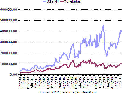 O preço da carne bovina in natura brasileira seguiu em alta no mercado internacional durante o último mês de agosto. O preço médio da carne bovina in natura exportada ficou em US$ 4.084/tonelada, 15,48% mais alto que o valor registrado no mesmo período de 2009.