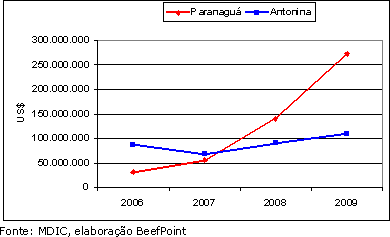 Mesmo com a queda das exportações brasileiras em 2009, devido a crise econômica global, vale destacar o desempenho dos portos do Paraná que tiveram em 2009 exportação superior em relação ao ano anterior. Segundo a SECEX (Secretaria de Comércio Exterior), do Ministério do Desenvolvimento, Indústria e Comércio, os Portos de Paranaguá e Antonina aumentaram em 97% suas atividades, o que representou um incremento nas exportações de carne bovina in natura em US$ 132 milhões e de US$ 14 milhões, respectivamente.
