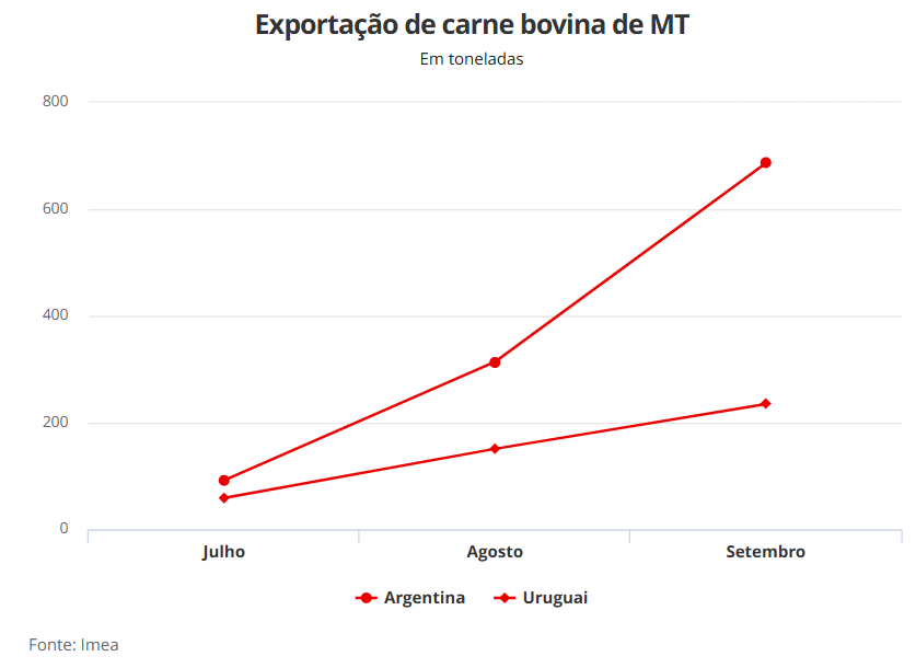 Já para o Uruguai, em agosto, foram 59 toneladas e, em setembro, foram 151 toneladas de carne bovina, o que representa aumento de 55,63% (veja mais detalhes abaixo).